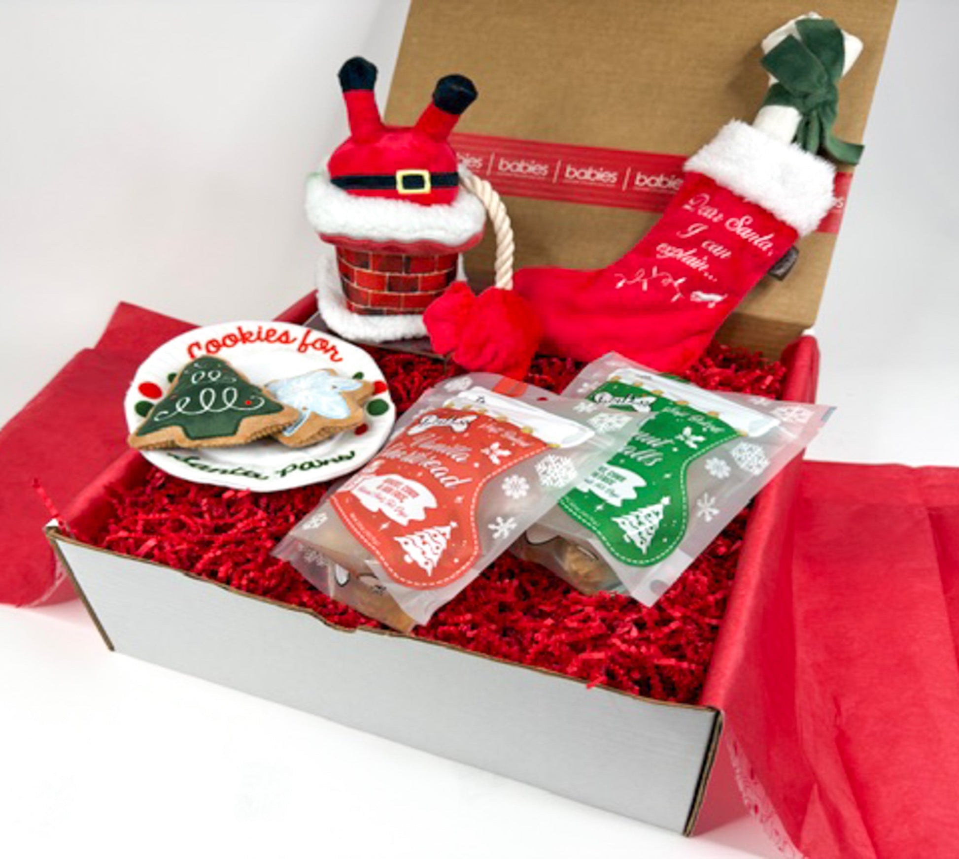 Ho ho ho—your pup's holiday dreams come true! This jolly gift box delivers three interactive toys designed to keep tails wagging all season long: a Santa in chimney toy, cookies for Santa Paws, and a holiday stocking packed with a bone toy. Two bags of delicious USA-made dog treats round out the festive fun. Everything arrives beautifully wrapped in our signature packaging with a personalized handwritten note. The perfect gift for the good boy or girl on your list!