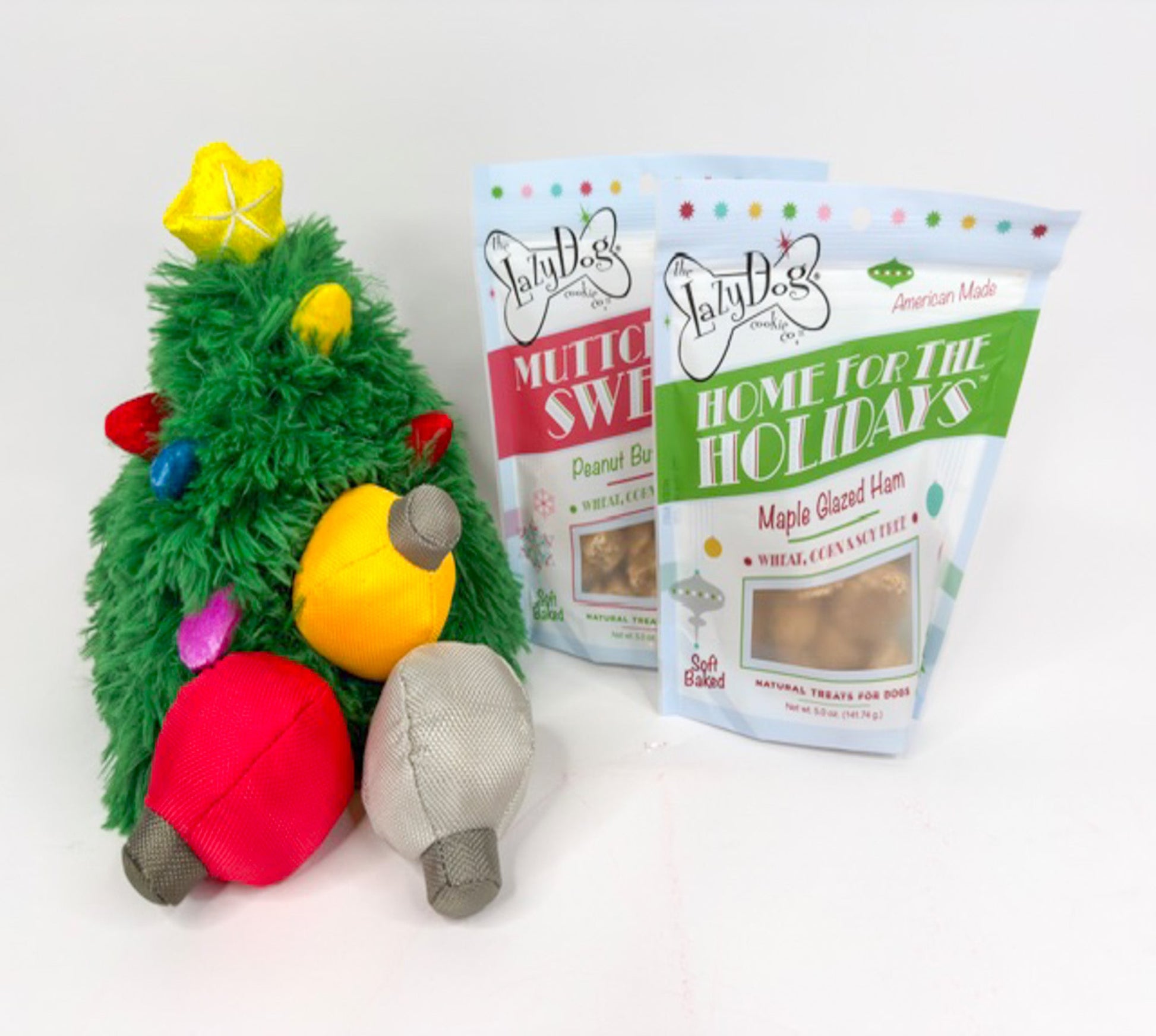 Deck the paws with the Holiday Doglas Fur Dog Gift Box—a tail-wagging celebration for your furry friend! This festive bundle features an interactive plush holiday tree toy with removable, bulb-shaped squeaker toys that keep pups entertained for hours. Two bags of delicious, USA-made holiday-themed dog treats round out the perfect present. Every box arrives beautifully wrapped in our signature packaging with a handwritten note, making it an extra-special gift straight from your heart to a pup's nose.